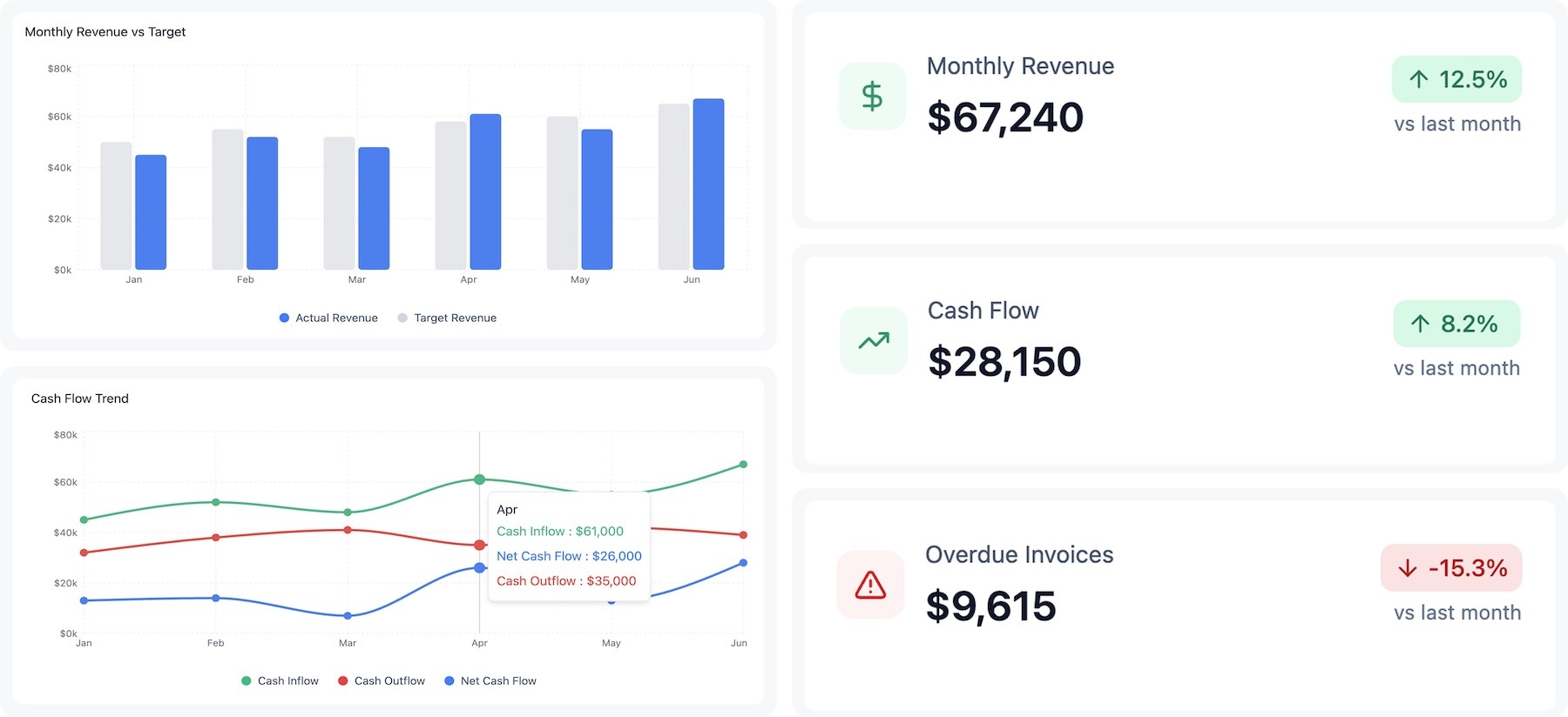 Early interviews showed small business owners care about staying profitable, not vanity metrics. I focused the dashboard on cash flow, overdue invoices and growth. It meant trading depth for clarity, but it helped surface quicker insights that could drive better decisions and improve retention.